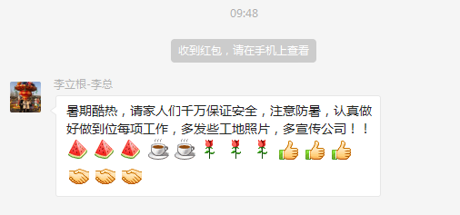炎熱酷暑老板關(guān)心慰問員工家人們,發(fā)個紅包提高大家的熱情!